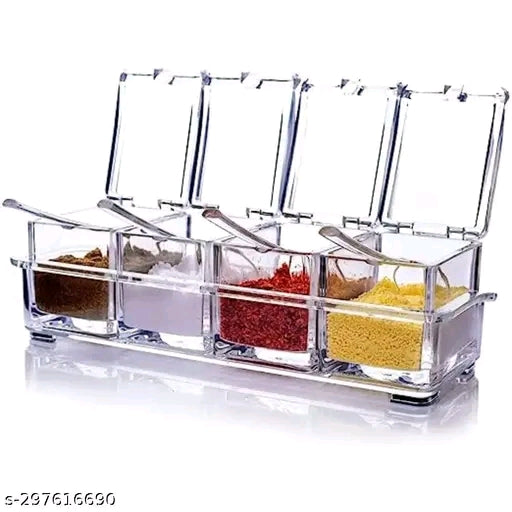 FreshDcart Transparent Acrylic 4-Grid Spice Box | Seasoning Kit with Serving Spoons - Organize Your Kitchen Spices, Pepper, Salt, and Masala (Pack of 1 Transparent Box)